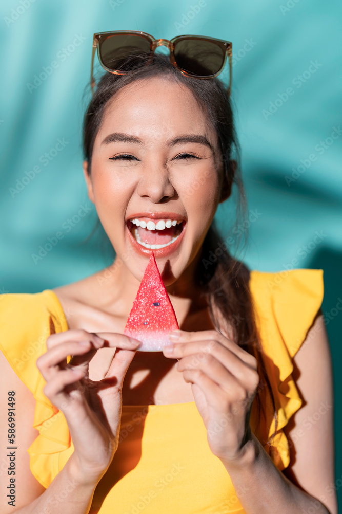 summer time delightful asian happiness woman enjoy summer travel vacation hand hold watermelon piece playful welcome smile for her trip,smiling summer cloth woman studio shot on blue colour background