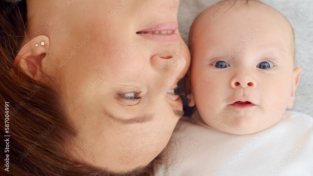 Happy newborn baby with his mother. Healthy newborn baby in a white t-shirt with mom. Closeup Faces of the mother and infant baby. Cute Infant boy and parent, top view. Happy family portrait