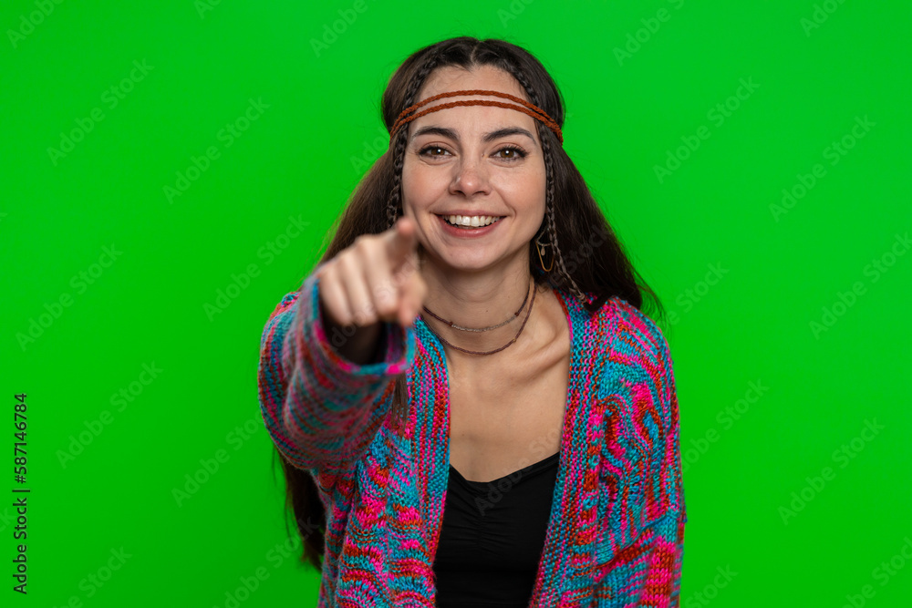 Amused hippie woman pointing finger to camera, laughing out loud, taunting making fun of ridiculous appearance, funny joke anecdote. Pretty girl isolated alone on chroma key background, green screen
