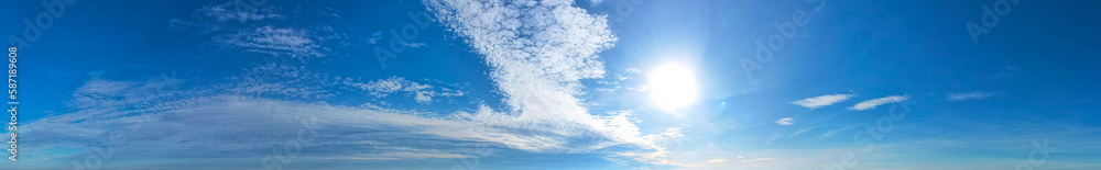 The panoramic view of the beautiful clear blue sky with white clouds and white light was a breathtaking sight, Sky background.