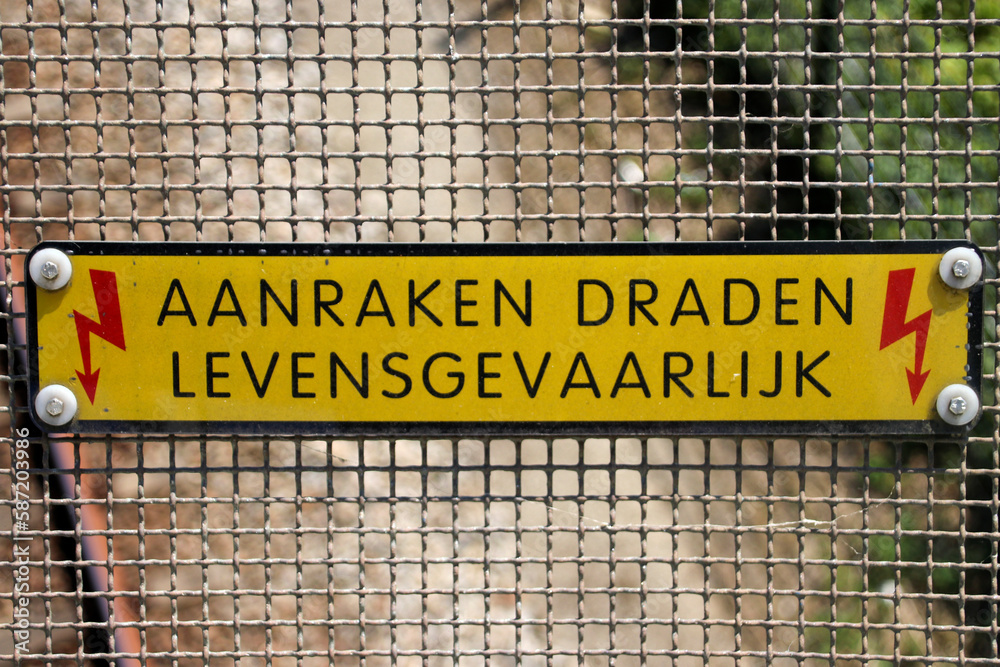 Sign at a viaduct in dutch "aanraken dragen levensgevaarlijk" which means touching wires is dangerous