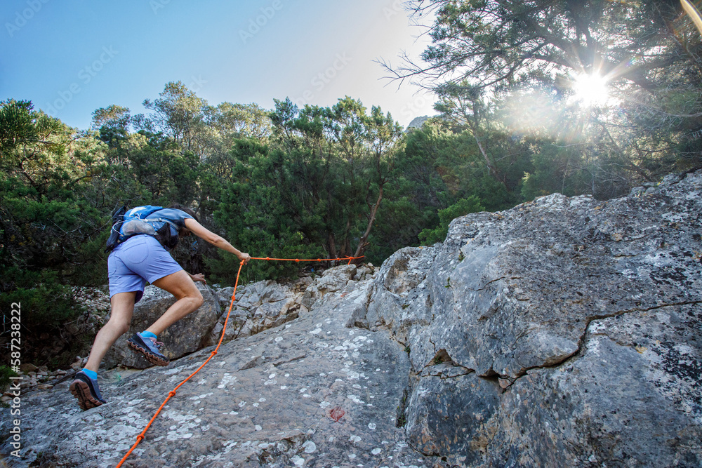 foto panoramica di una costa della Sardegna mentre un escursionista compie una" ferrata" nella parete rocciosa