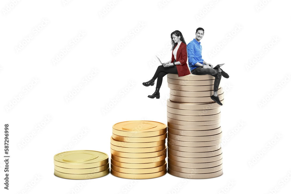 Team of Businesswoman and Businessman with laptop on a stack of money isolated on free PNG background. Success Concept. Art collage.