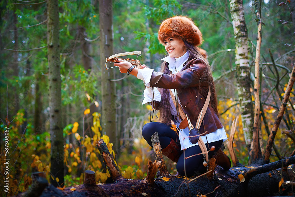 Girl in a leather jacket, a big red fox fur hat and with a crossbow in the forest in autumn. A female model poses as a fabulous royal huntress on a nature hunt at a photo shoot
