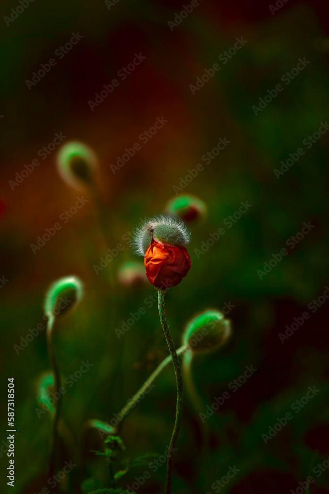 Close-up of Red poppy Buds on a Background of Greenery. a photo in a dark key, great for a poster in a room. Spring still life, blooming flowers. small depth of field, bokeh. The concept of awakening