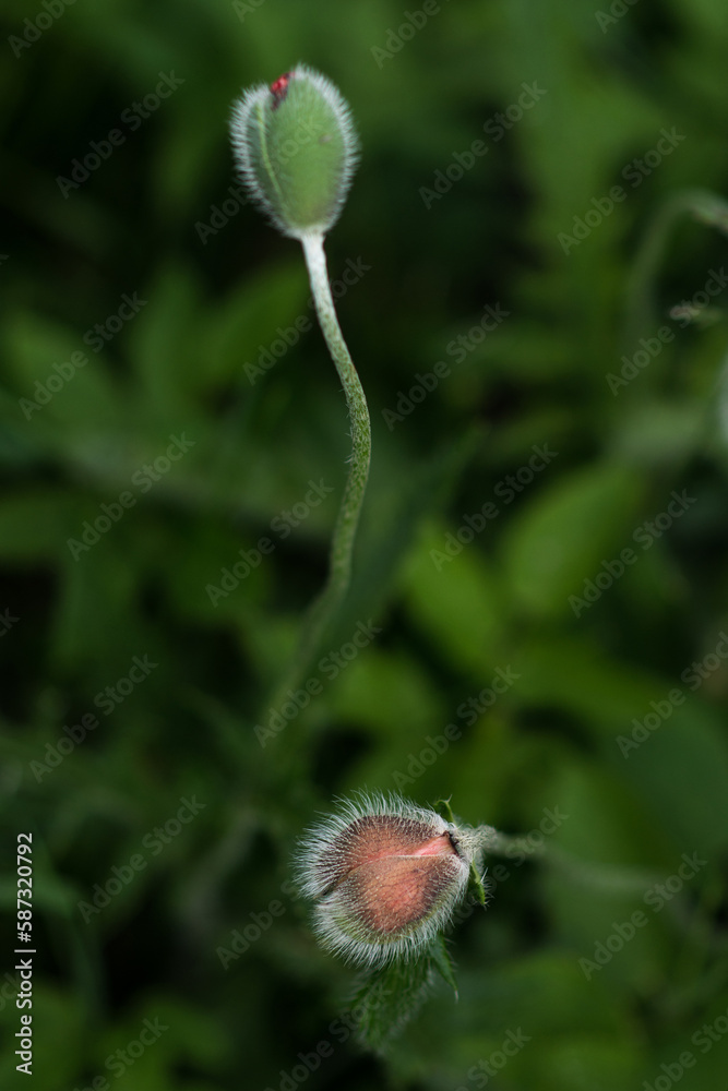 Close-up of a budding Red Poppy against a background of greenery and other unopened buds. Bright spring photo. Spring still life, Small depth of field, Bokeh. The concept of awakening and Spring Mood