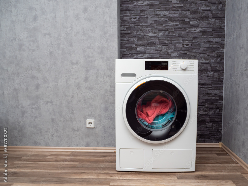 Laundry room interior with washing machine against the wall. Modern washing machine.