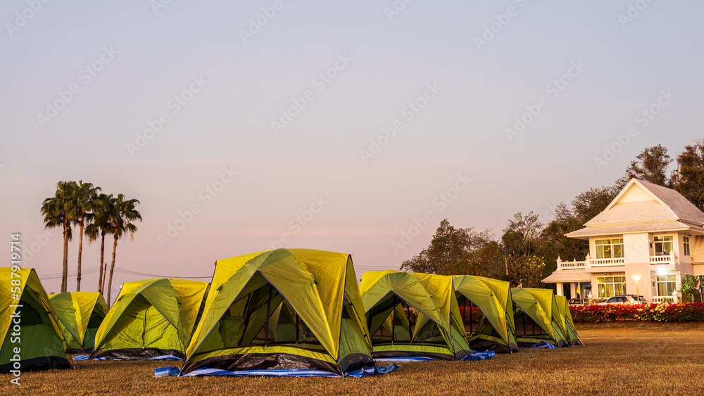 Scenery of many green tents for outdoor activities set up on dry lawn outside.