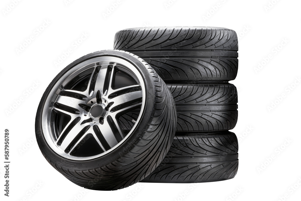A set of summer wheels, tires and discs a stack of isolates.