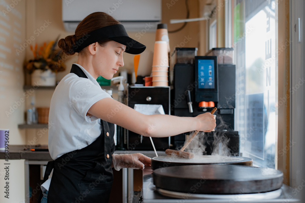 Portrait woman chef baking pancakes in an apron uniform. Fast food service of the city. fast food restaurant is a small business.