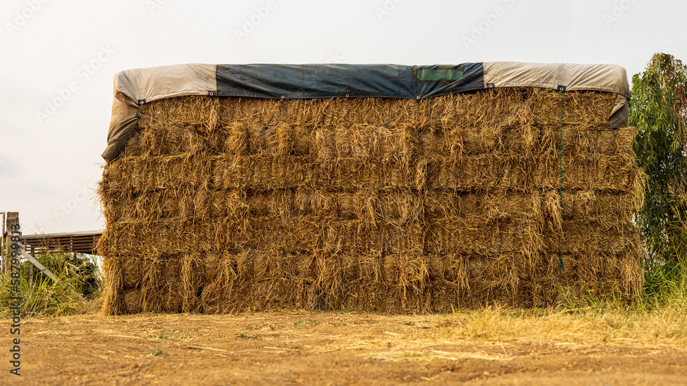 A low angle view. Heaps of straw bales taken from the harvested rice fields stacked.