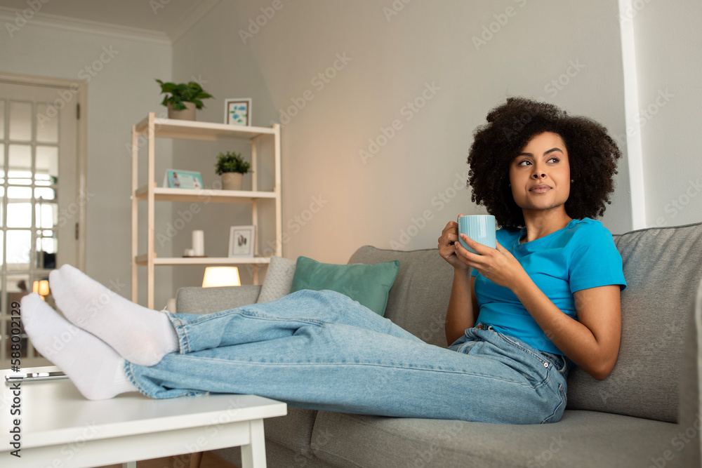 Thoughtful millennial african american curly lady enjoy relax and cup of tea on sofa, think, look at free space