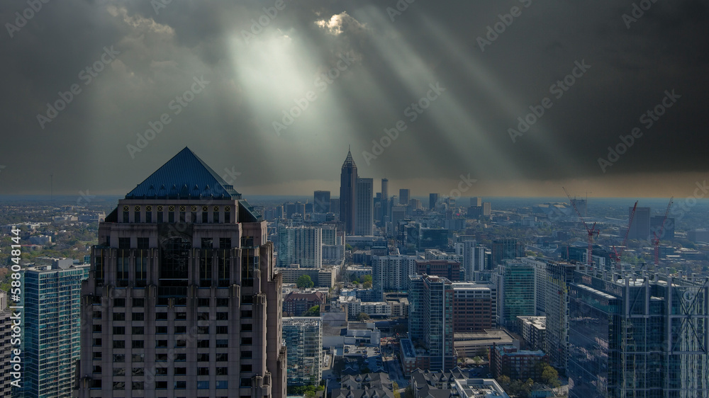 aerial shot of the skyscrapers, office buildings and tower cranes in the city skyline with cars and trucks driving on the street with powerful clouds at sunset in downtown Atlanta Georgia USA