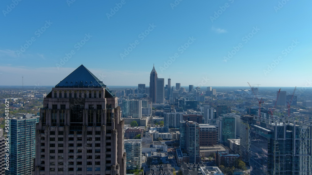 aerial shot of the skyscrapers, office buildings and tower cranes in the city skyline with cars and trucks driving on the street with blue sky and clouds in downtown Atlanta Georgia USA