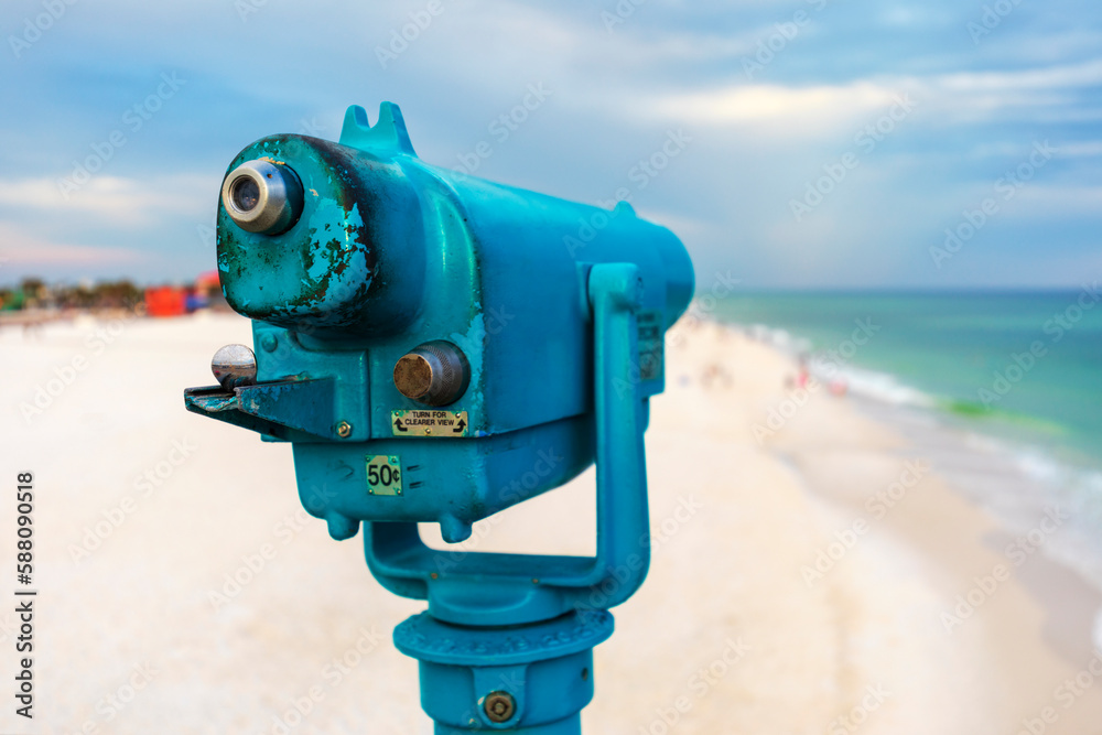 A light blue coin-operated telescope mounted on the Pensacola fishing pier