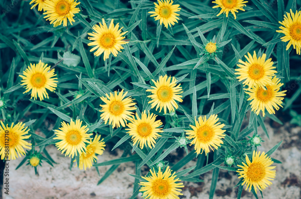 tine yellow flowers with green leaves background