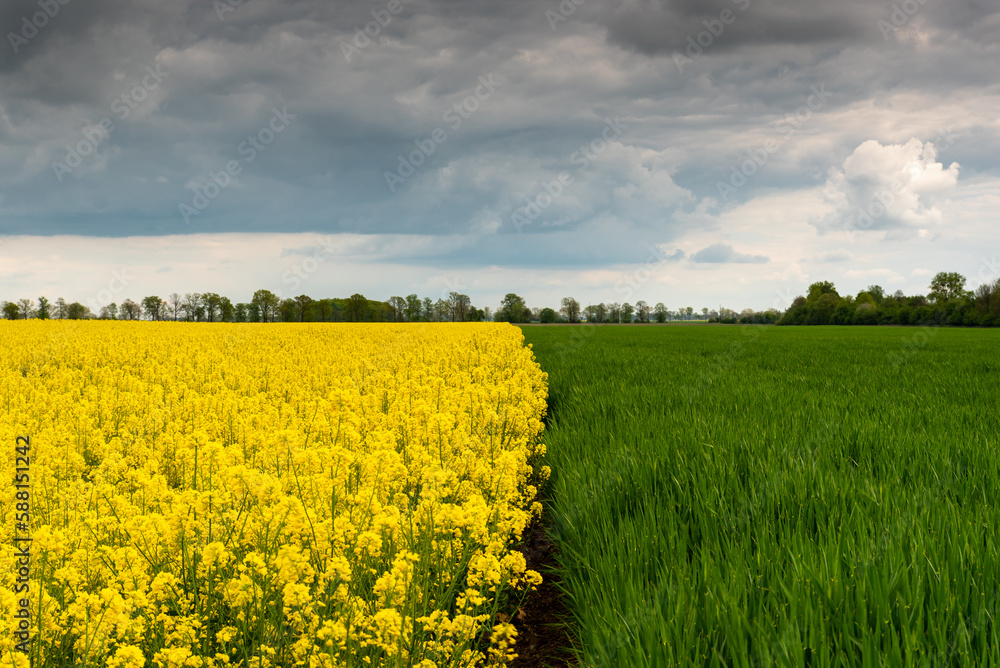 Kwitnący rzepak po sąsiedzku z uprawą zboża