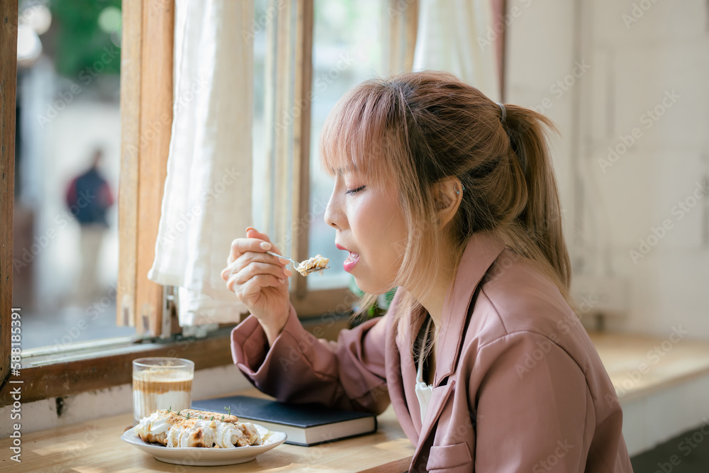 Happy asian woman sitting and eating croissant on plate in dessert cafe while reading a book