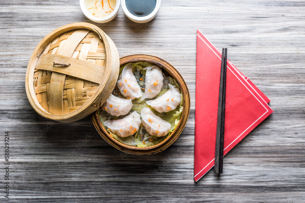 Prawn Hargao with sauce and chopsticks isolated on wooden board top view on table fastfood