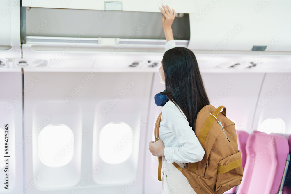 Young asian attractive woman travel by airplane, Passenger wearing headphone putting hand baggage in lockers above seats of plane
