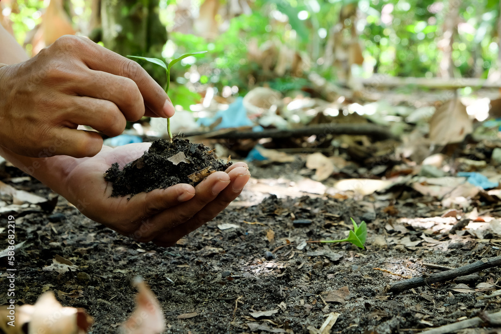 Green plants start growing from seed in organic soil in farmer's hands
