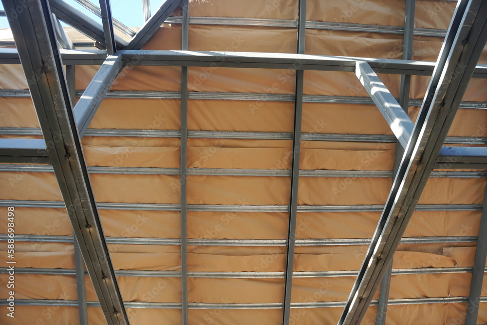 One-sided aluminum foil sheet insulation installed under the roof during construction for reflection heat radiation and protect heat in to house. Attic insulation.