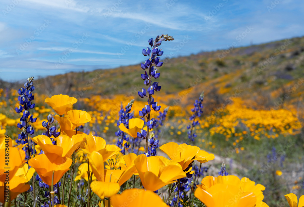 Close Up View of Mexican Poppies and Lavender Lupines In The Arizona Desert Near Phoenix 2023