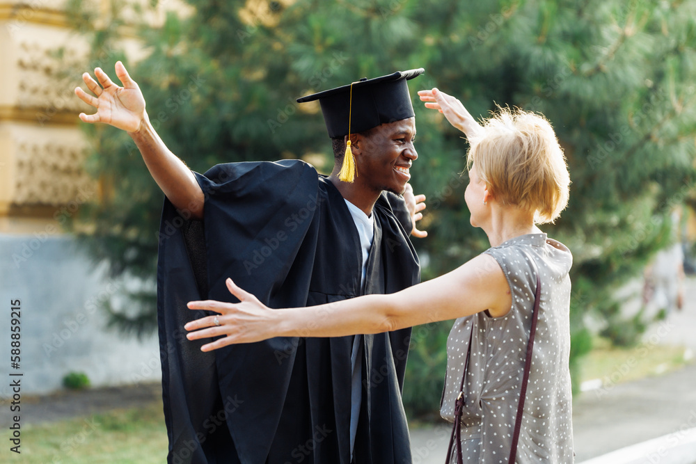 Portrait of glad afro american student in black graduation mantle and hat open arms wide to hug woman. Higher education, graduate from university, employment, ceremonial celebration.