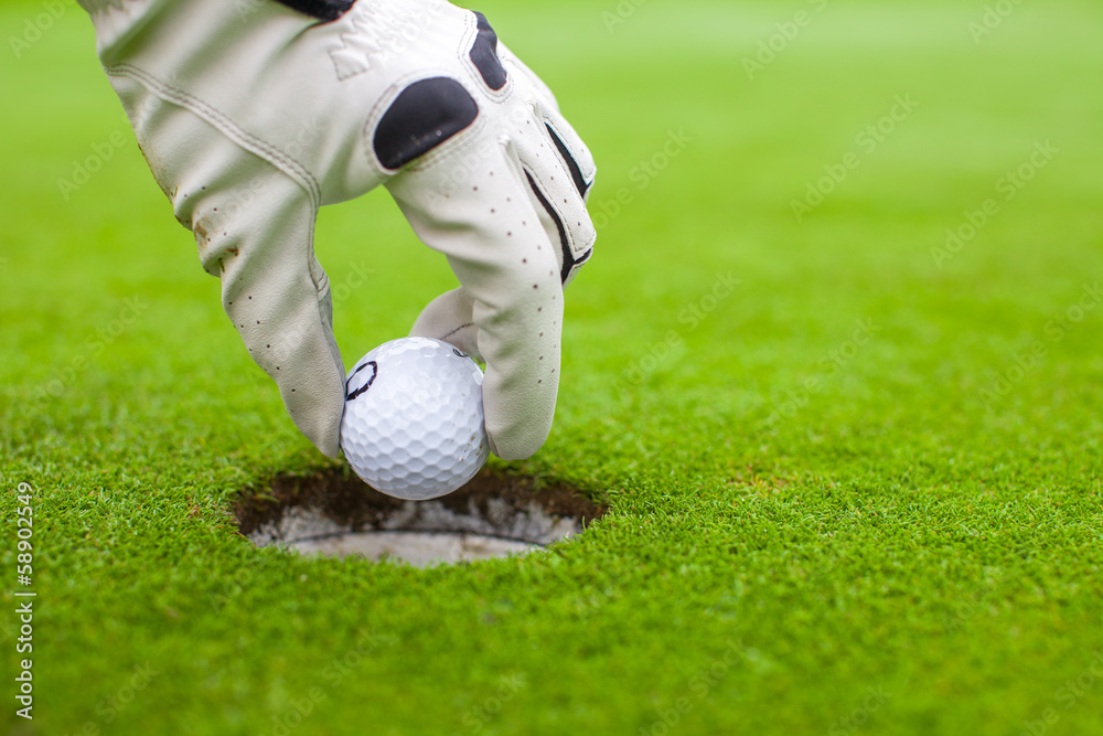 Man's hand putting a golf ball into a hole on the green field