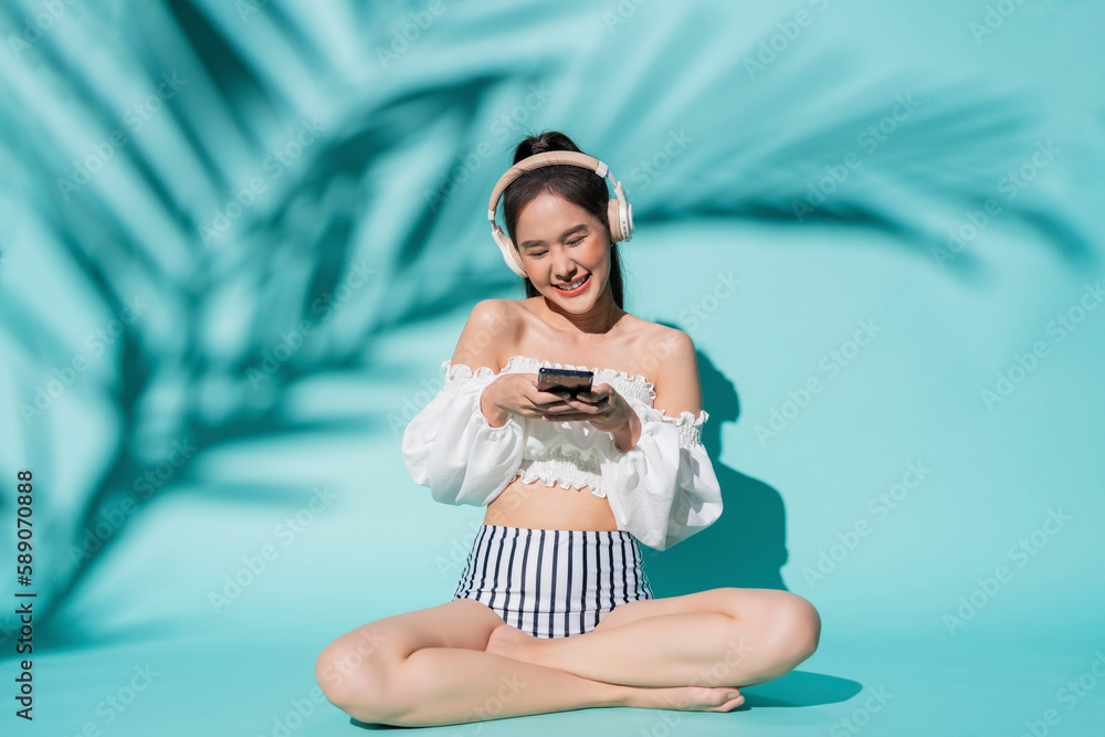 delight freshness asia woman hand using smartphone application device choosing song for headphone listen,summer vacation woman smiling enjoy day time of summer travel studio shot on colour background,