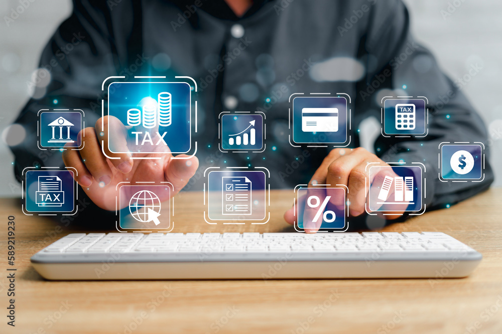 Financial research, government tax, and calculation tax return concept, Businessman using desktop and pointing on tax and Financial icon and use laptop keyboard input tax detail on virtual screen