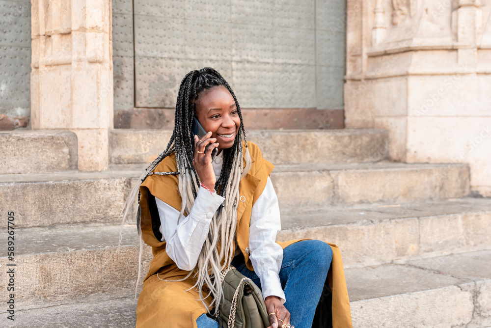 smiling african american woman with braids sitting on the stairs in the city talking on the cellphone
