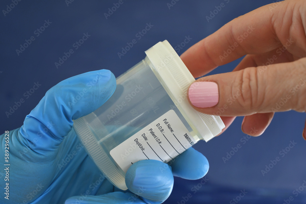 Medical personnel doctor nurse handing patient urine specimen cup for sample to be tested.