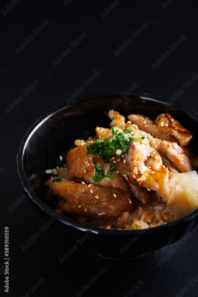Grilled Chicken teriyaki rice Japanese food isolated in black background