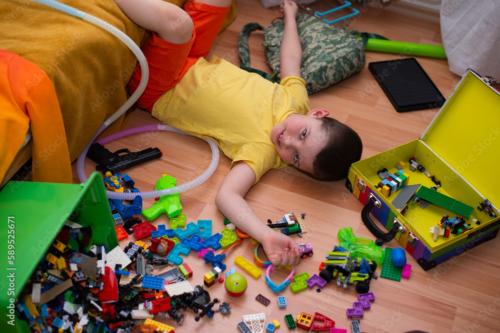 A cute six year old child boy lies on the floor in a pile of his toys. A mess in the children's room.