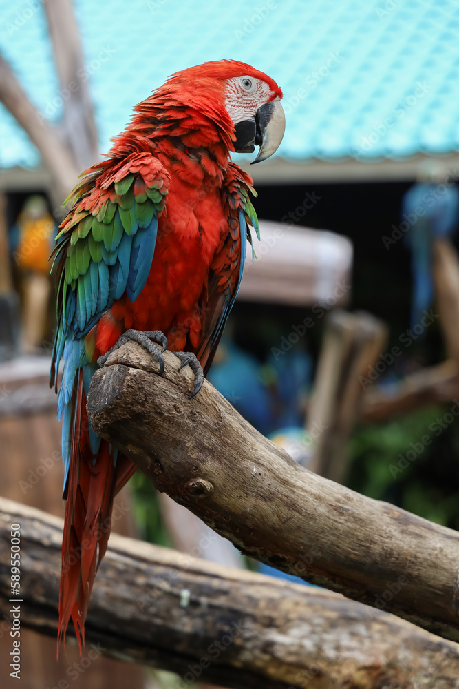 Close up head the red macaw parrot bird in garden