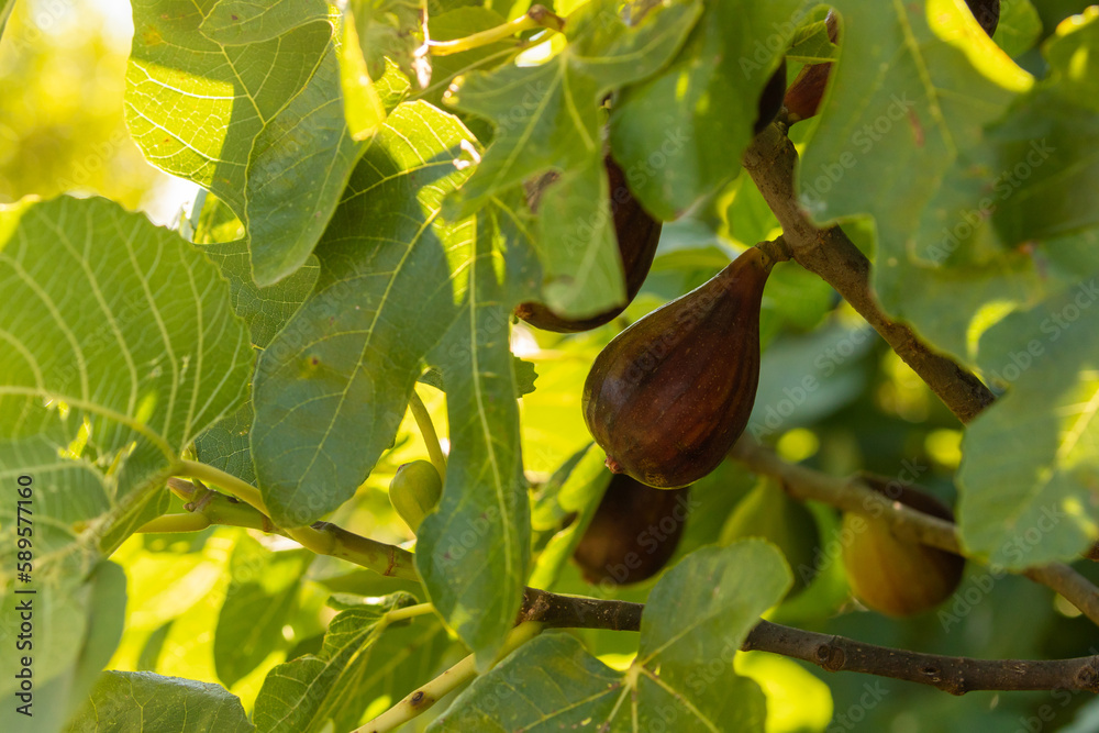 Figs in the process of ripening, hanging from the branches of a tree of the species Ficus carica, example of fruit cultivation in rural areas of Spain