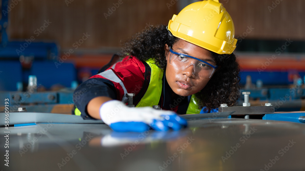 Industrial Engineers or Foreman inspecting and check up machine at factory machines.Technician working in metal sheet at industry..