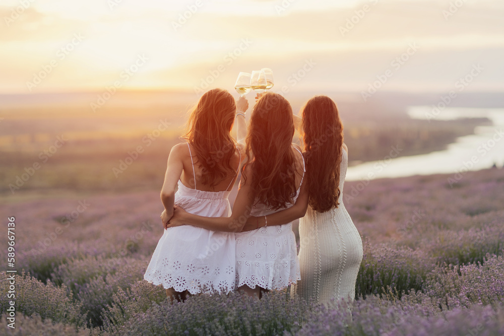 Lovely ladies drinking wine in lavender field at sunset. Summer happy mood. Girlfriends relaxing on summer sunset with river on the background.