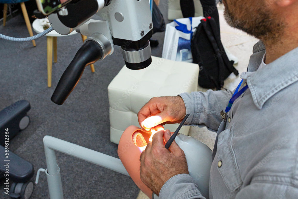 A dentist learns to work with a dental microscope. A dentist tests an endodontic microscope in a store before buying.