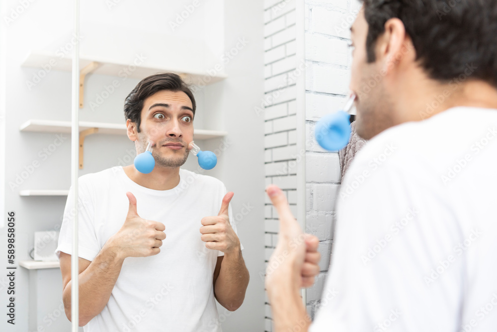 Handsome man standing in front of the mirror and doing facial massage with vacuum cups. Skin care and healthy lifestyle concept