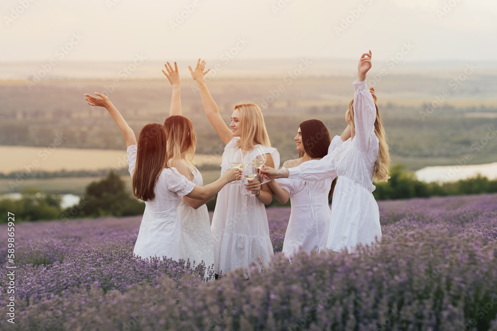 Girlfriends with hands up at sunset. They having picnic in the lavender field and enjoying beautiful landscape with river and sunset