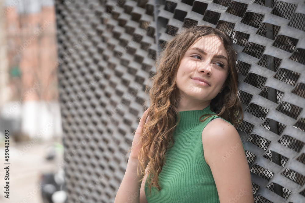 A close-up portrait of a confident looking young woman with a green shirt against a gray background.