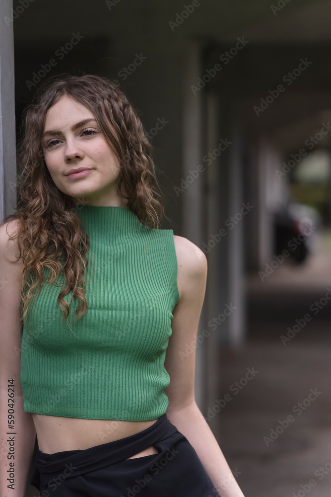 A close-up portrait of a confident looking young woman with a green shirt against a gray background.