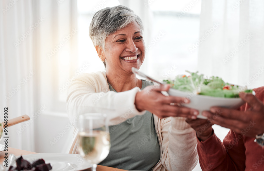 Family dinner, senior woman and salad of a happy female with heathy food in a home. Celebration, together and people with unity from eating at table with happiness and a smile in a house giving meal