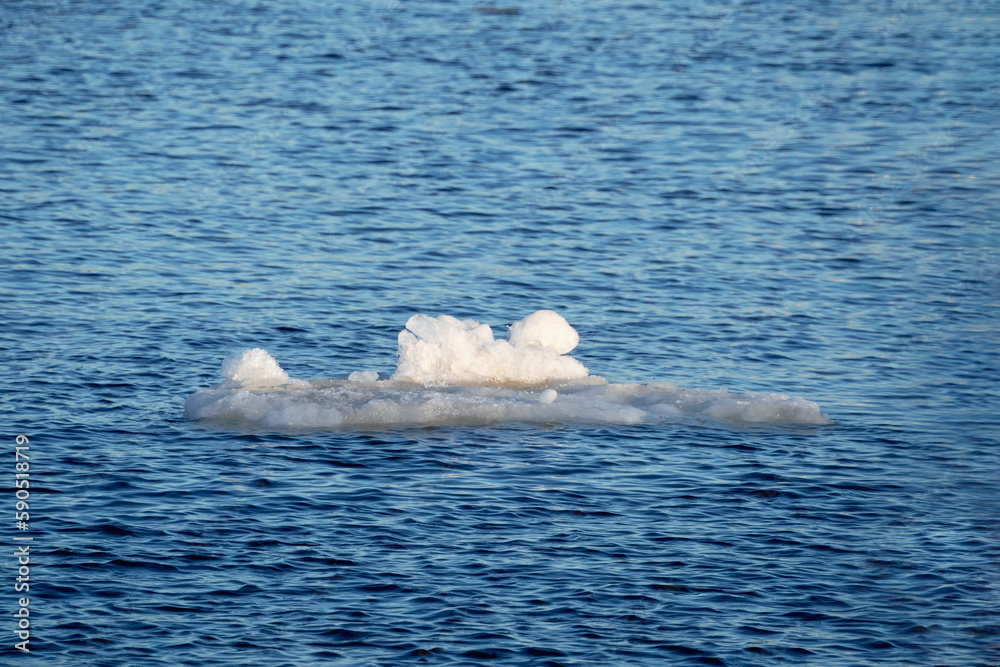 White iceberg of the remnants of ice floats on the blue water. The ice melts in the spring. Natural background.