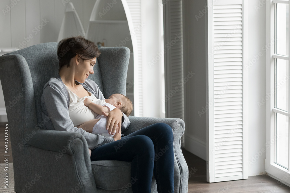 Happy pretty new mom breastfeeding little baby, resting in armchair at home, holding infant in arms, looking at kid, smiling. Mother feeding kid milk from breast, caring for natural nutrition