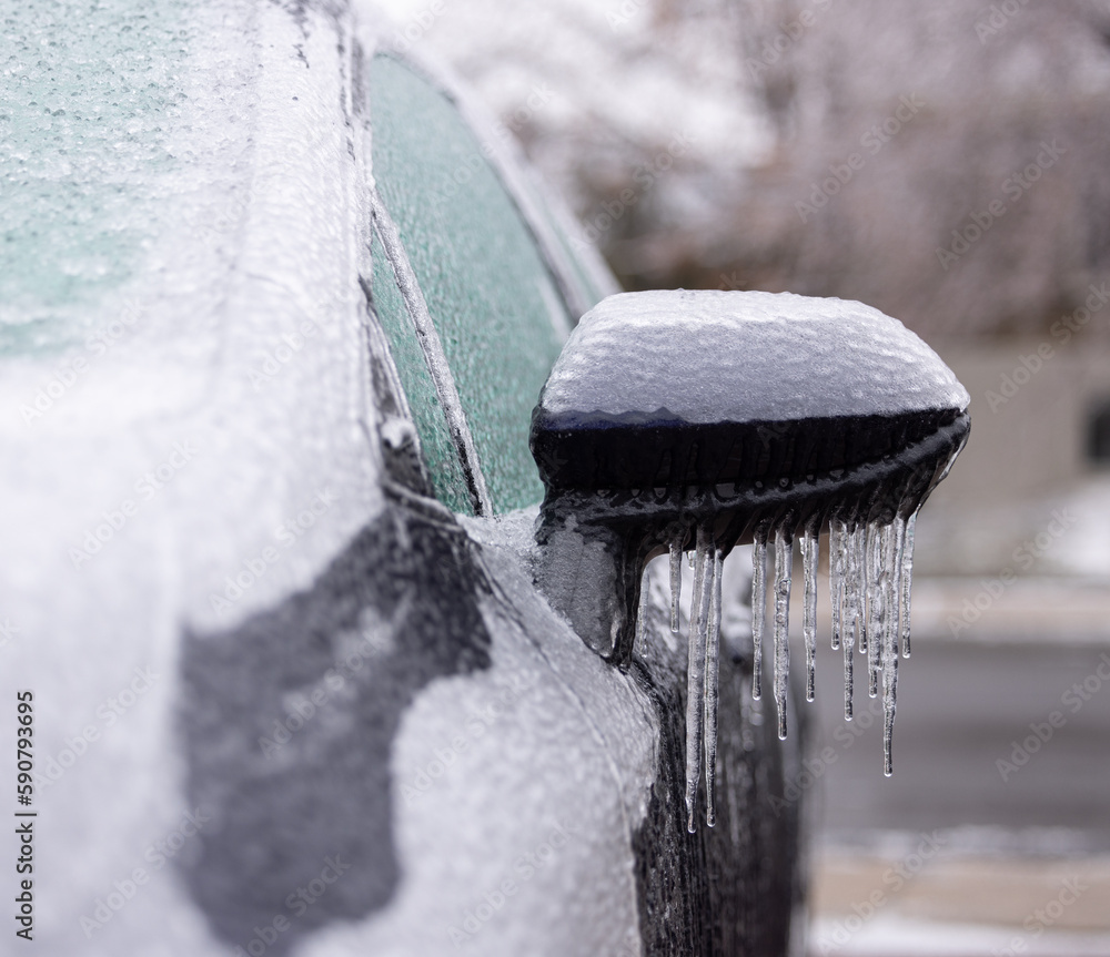Tempête verglas et voiture couverte de glace