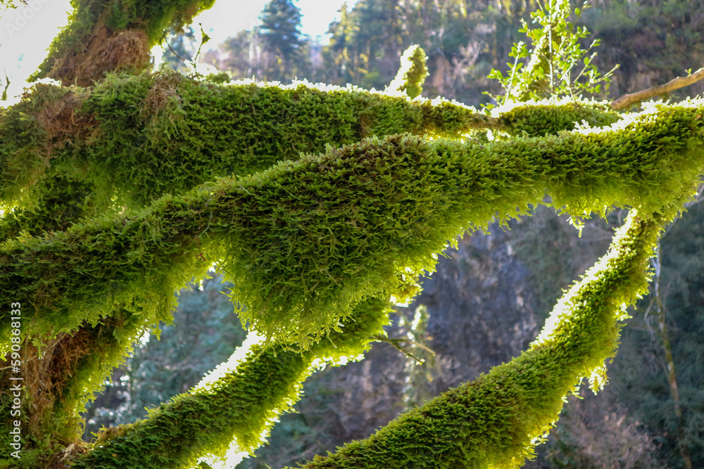 fairy tree in the green moss on blue sky background close up view
