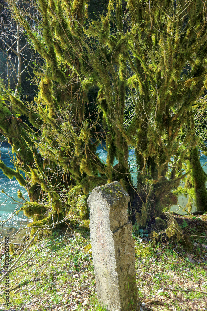 fairy trees in the green moss on the bank of a mountain river